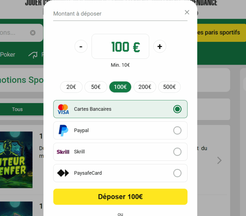Dépose la somme que tu souhaites jouer. N’oublie pas : plus ton premier dépôt est élevé (jusqu’à 100€), plus ton pari remboursé est potentiellement gros. Enfin, Unibet t’enverra un code par courrier à ton adresse pour la validation définitive de ton compte. Saisis ce code dans la section « Mon Compte » pour tout débloquer définitivement. Cette étape est obligatoire pour pouvoir retirer tes gains, ne la néglige pas!