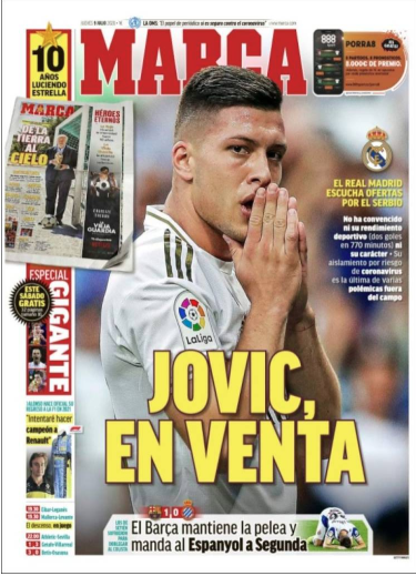 Aujourd’hui, le sujet du jour concernant le mercato du Real Madrid se trouve sur la une de Marca. Le journal espagnol assure que Luka Jovic est à vendre.